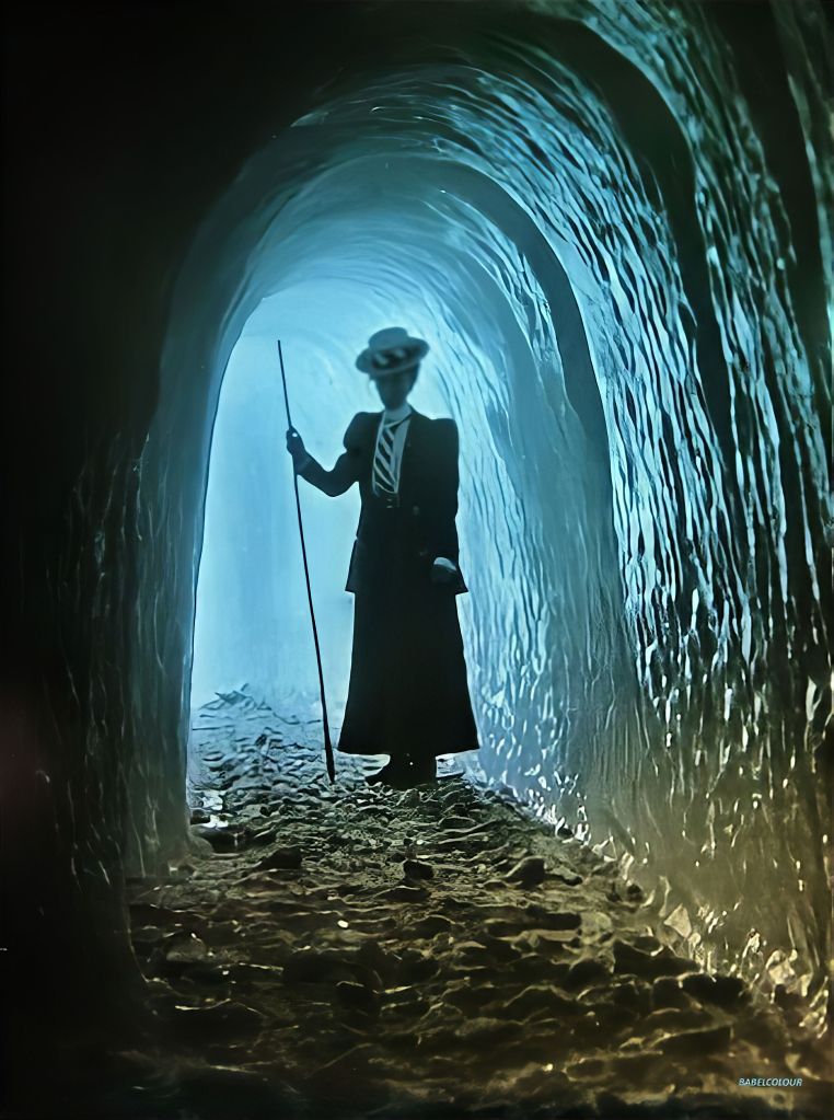 *This photo was taken by early colour photographer Ellis Kelsey in the Swiss Alps around 1898, capturing the somwhat sinister silhouette of his sister Edith in an ice cave. She isn’t a Missy to mess with! Enhanced by Stuart Humphryes: known on-line as BabelColour